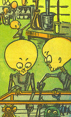 In earlier ages of Mars the Brain Men had their own civilization located in underground cities. They ruled over most of Mars only occasionally venturing onto the surface and travelling to other planets (including Earth) to collect samples and victims for experiments. Though they have leaders (called the Great Skomahs), all of which are inventors of great renown, they are not normally an ambitious people. The Brain Men want to conduct research, tinker with new devices, and to be left alone.